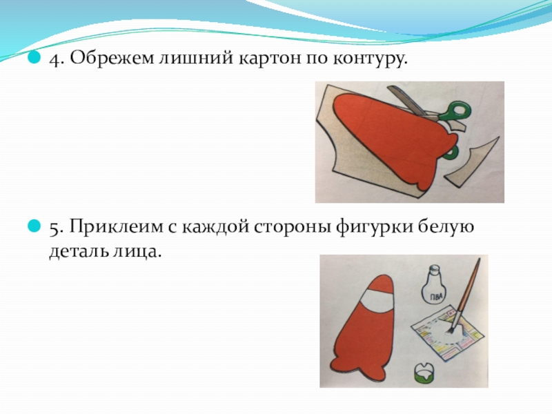 4. Обрежем лишний картон по контуру.5. Приклеим с каждой стороны фигурки белую деталь лица.