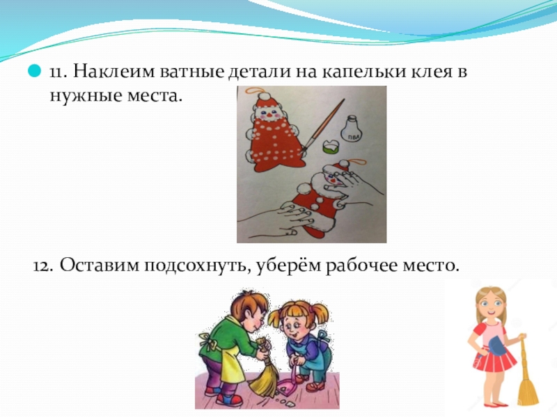 11. Наклеим ватные детали на капельки клея в нужные места.12. Оставим подсохнуть, уберём рабочее место.