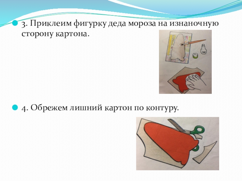 Слайд 73. Приклеим фигурку деда мороза на изнаночную сторону картона.