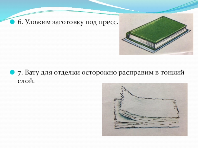 6. Уложим заготовку под пресс.7. Вату для отделки осторожно расправим в тонкий слой.