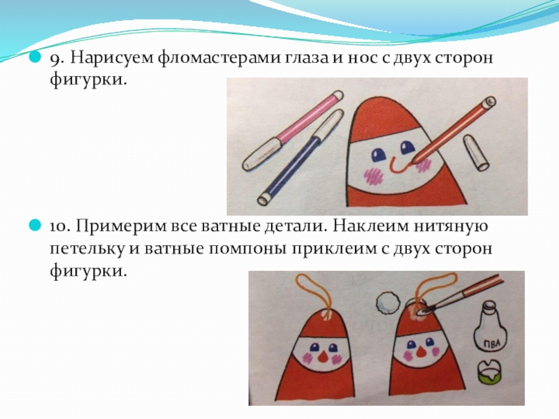 9. Нарисуем фломастерами глаза и нос с двух сторон фигурки.10. Примерим все ватные детали. Наклеим нитяную петельку