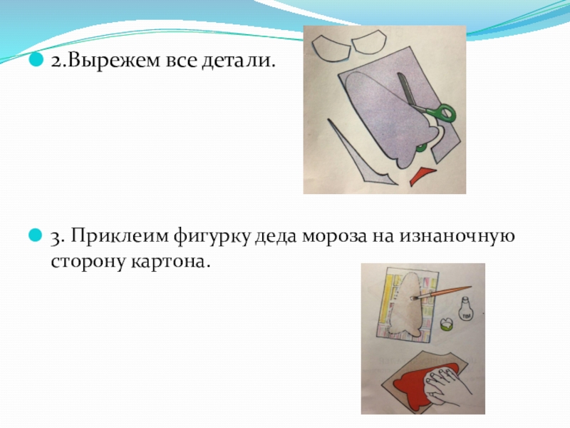 2.Вырежем все детали.3. Приклеим фигурку деда мороза на изнаночную сторону картона.