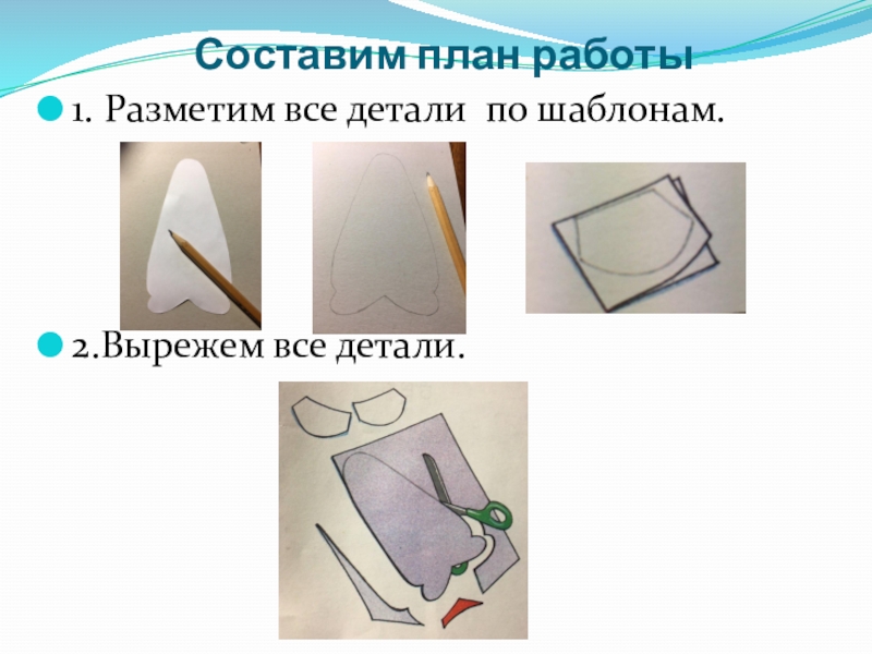Составим план работы1. Разметим все детали по шаблонам.2.Вырежем все детали.