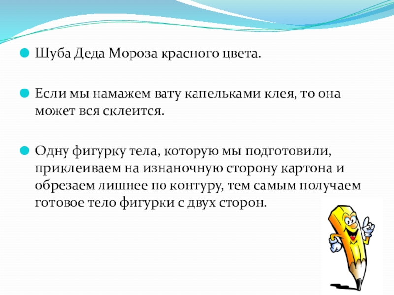 Шуба Деда Мороза красного цвета.Если мы намажем вату капельками клея, то она может вся склеится.Одну фигурку тела,