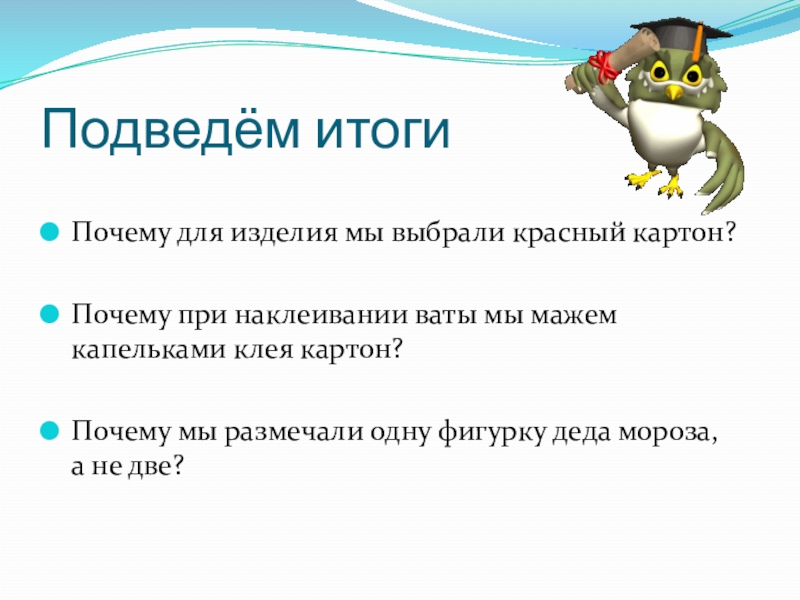 Подведём итогиПочему для изделия мы выбрали красный картон? Почему при наклеивании ваты мы мажем капельками клея картон?Почему