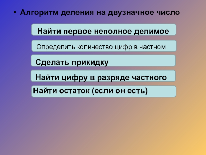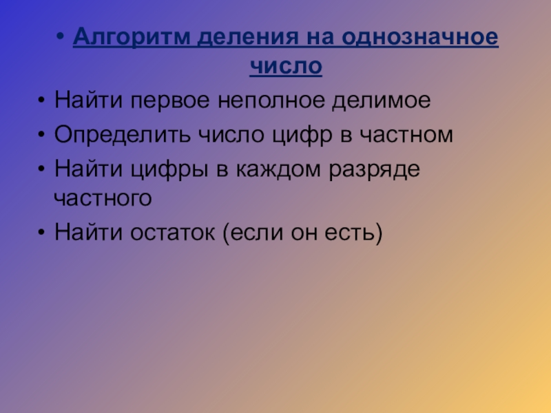 Алгоритм деления на однозначное числоНайти первое неполное делимоеОпределить число цифр в частномНайти цифры в каждом разряде частногоНайти