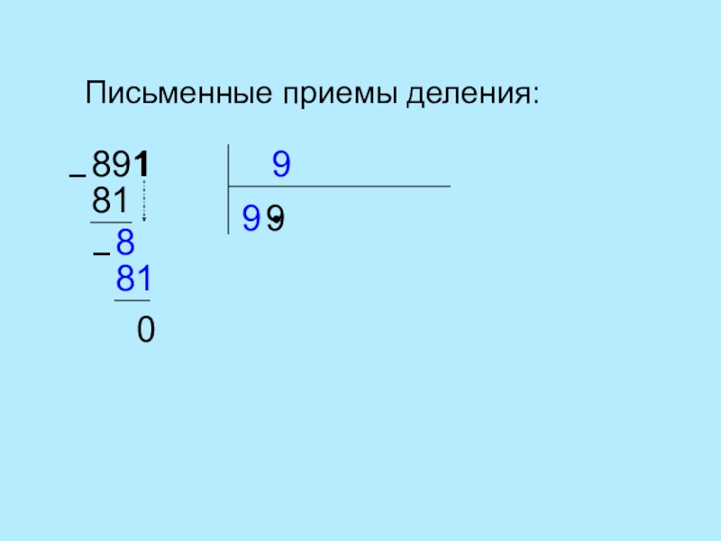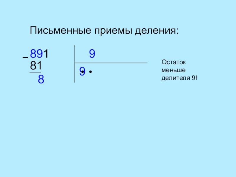 Письменные приемы деления:98919●818Остаток меньше делителя 9!●