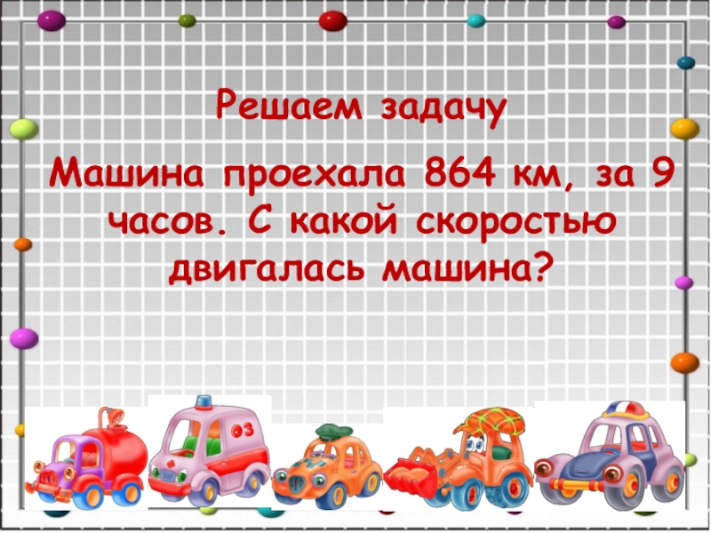 Решаем задачуМашина проехала 864 км, за 9 часов. С какой скоростью двигалась машина?