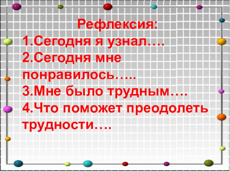 Рефлексия:1.Сегодня я узнал….2.Сегодня мне понравилось…..3.Мне было трудным….4.Что поможет преодолеть трудности….