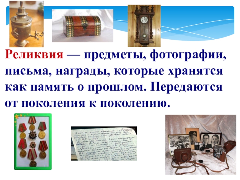 Слайд 29Реликвия — предметы, фотографии, письма, награды, которые хранятся как память о
