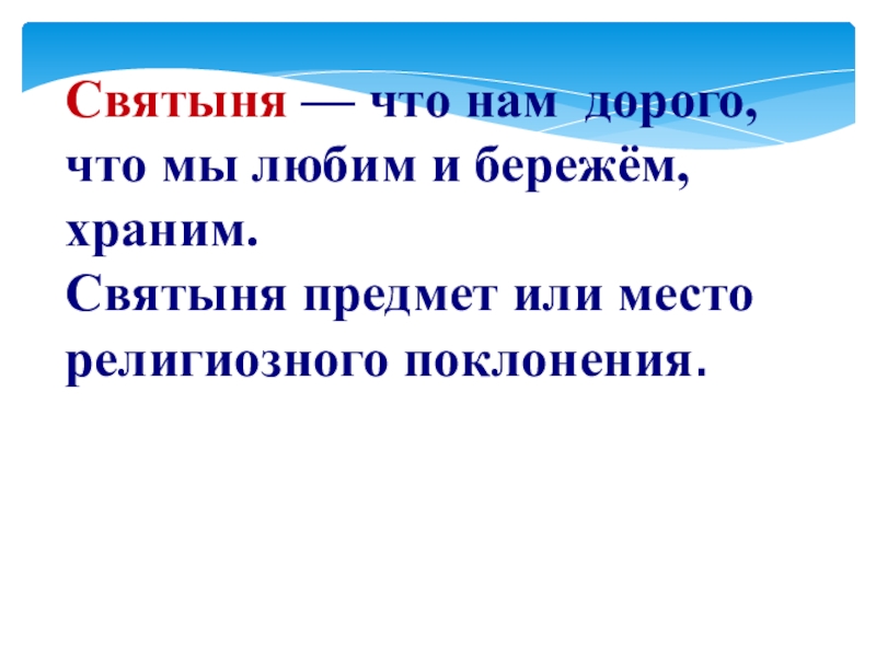 Святыня — что нам дорого,что мы любим и бережём, храним. Святыня предмет или место религиозного поклонения.