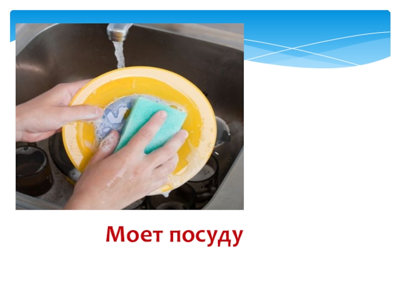 Слайд 18Моет посуду