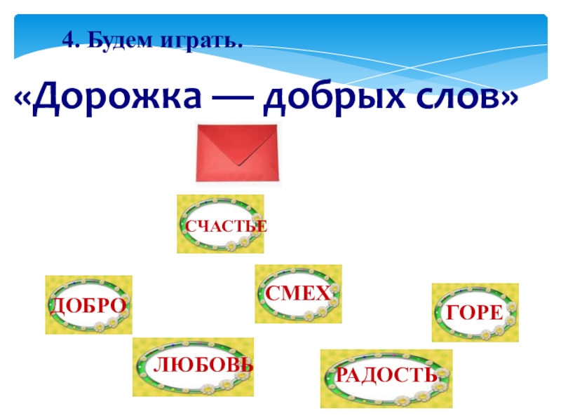 4. Будем играть.«Дорожка — добрых слов»ДОБРОСЧАСТЬЕЛЮБОВЬСМЕХРАДОСТЬГОРЕ