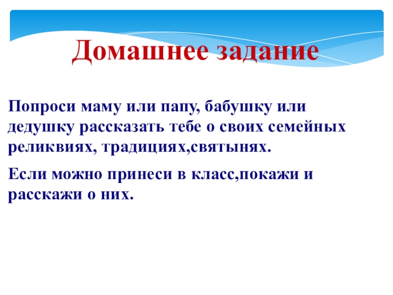 Домашнее заданиеПопроси маму или папу, бабушку или дедушку рассказать тебе о своих семейных реликвиях, традициях,святынях.Если можно принеси