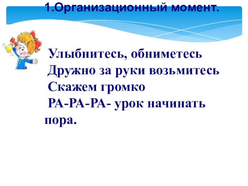 1.Организационный момент. Улыбнитесь, обниметесь Дружно за руки возьмитесь Скажем громко РА-РА-РА- урок начинать пора.