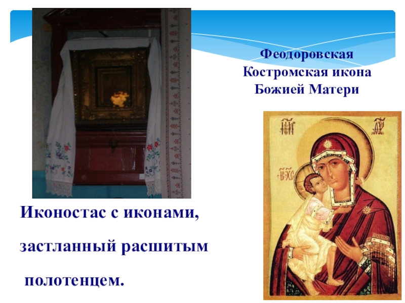 Иконостас с иконами,застланный расшитым полотенцем.Феодоровская Костромская икона Божией Матери