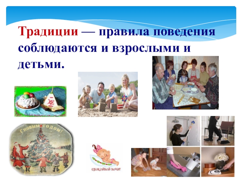 Слайд 30Традиции — правила поведения соблюдаются и взрослыми и детьми.