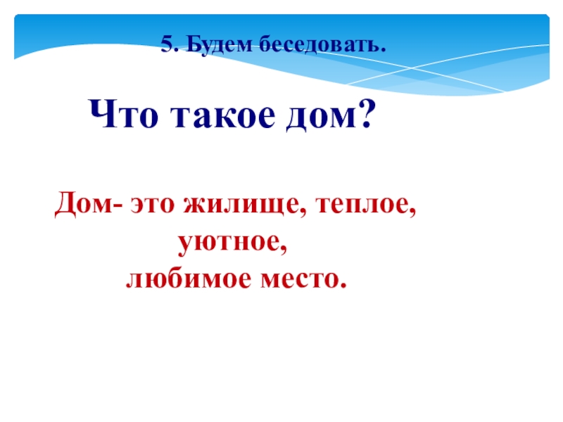 5. Будем беседовать.Что такое дом? Дом- это жилище, теплое, уютное,
