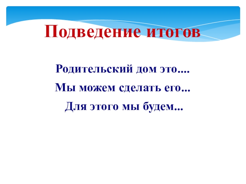 Подведение итоговРодительский дом это....Мы можем сделать его... Для этого мы будем...