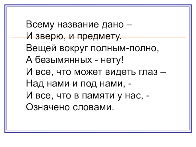 Слайд 19Всему название дано – И зверю, и предмету. Вещей вокруг полным-полно, А безымянных -