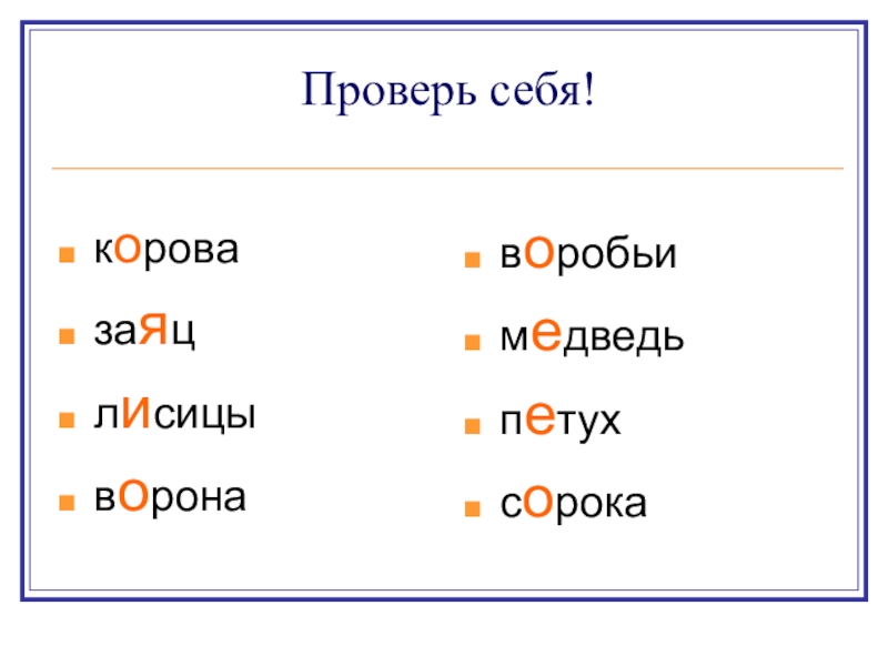 Проверь себя!коровазаяцлисицыворонаворобьимедведьпетухсорока