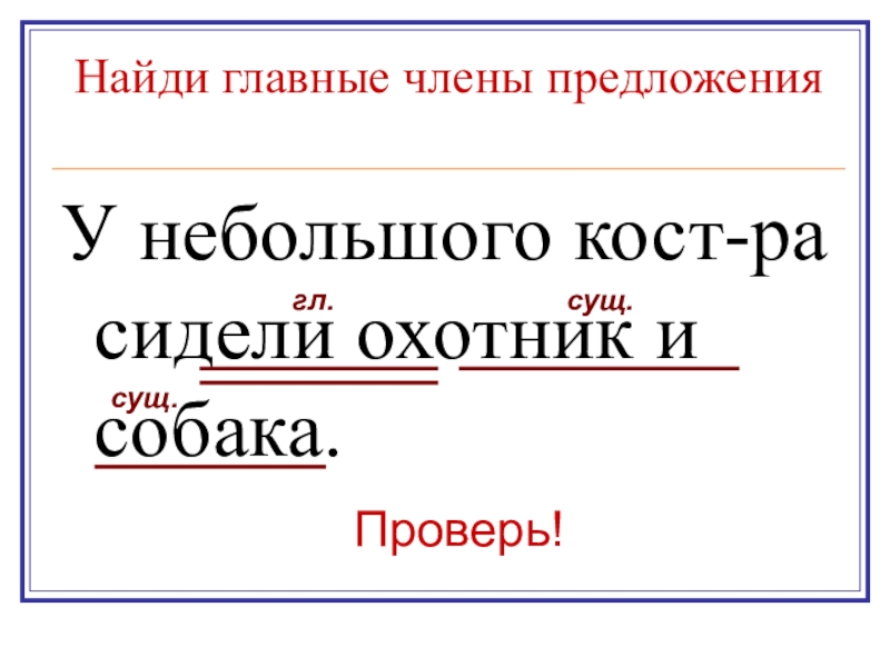 Найди главные члены предложения У небольшого кост-ра сидели охотник и собака.гл.сущ.сущ.Проверь!