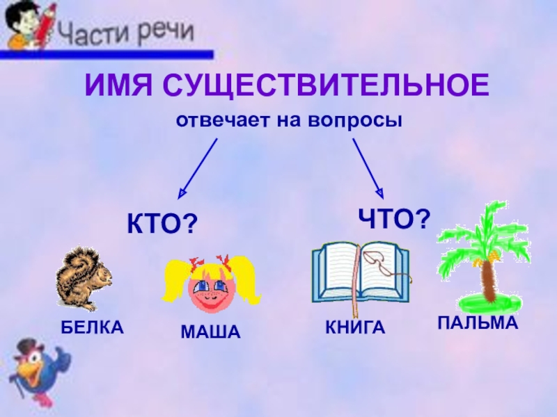 ИМЯ СУЩЕСТВИТЕЛЬНОЕотвечает на вопросыКТО?ЧТО?БЕЛКАМАШАКНИГАПАЛЬМА