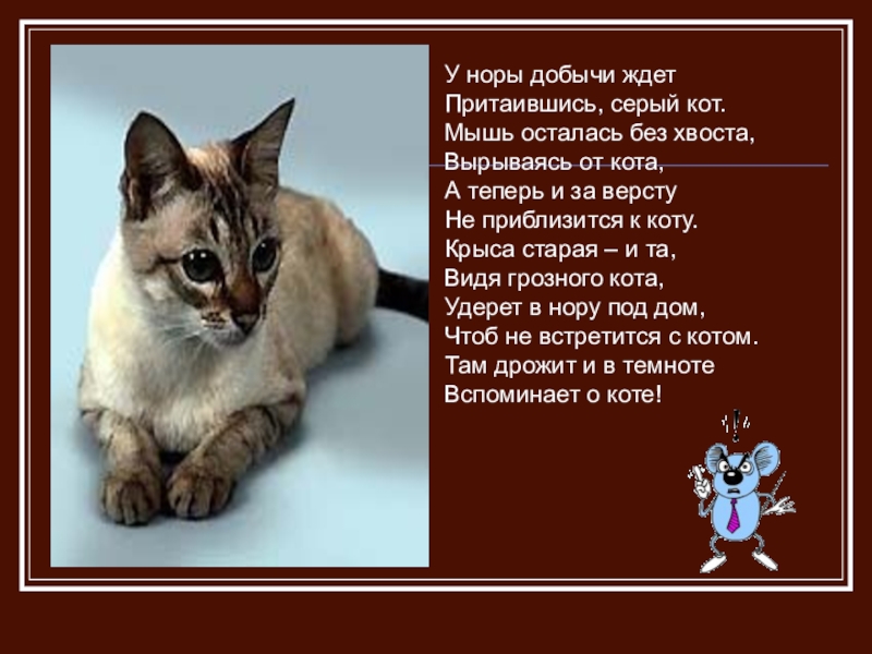 Слайд 13У норы добычи ждет Притаившись, серый кот. Мышь осталась без хвоста, Вырываясь от кота, А