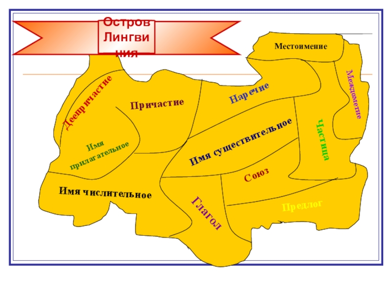 Остров ЛингвинияИмя существительноеИмя прилагательноеДеепричастиеПричастиеНаречиеИмя числительноеМестоимение Союз Предлог ГлаголЧастицаМеждометие