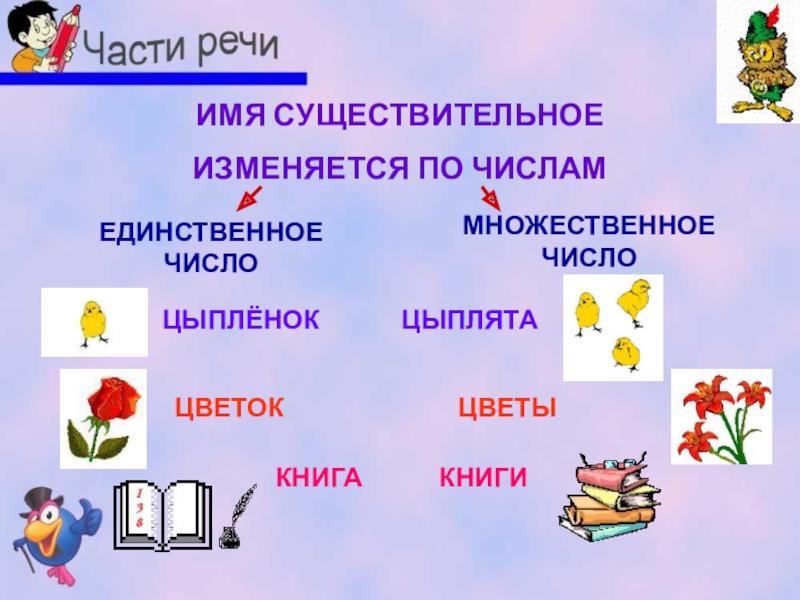 ИМЯ СУЩЕСТВИТЕЛЬНОЕИЗМЕНЯЕТСЯ ПО ЧИСЛАМЕДИНСТВЕННОЕ ЧИСЛОМНОЖЕСТВЕННОЕ ЧИСЛОЦЫПЛЁНОКЦВЕТОККНИГАЦЫПЛЯТАЦВЕТЫКНИГИ