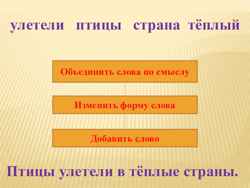 улетели  птицы  страна тёплыйОбъединить слова по смыслуИзменить форму словаДобавить словоПтицы улетели в тёплые страны.