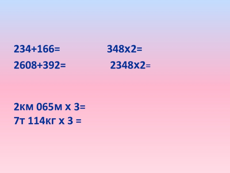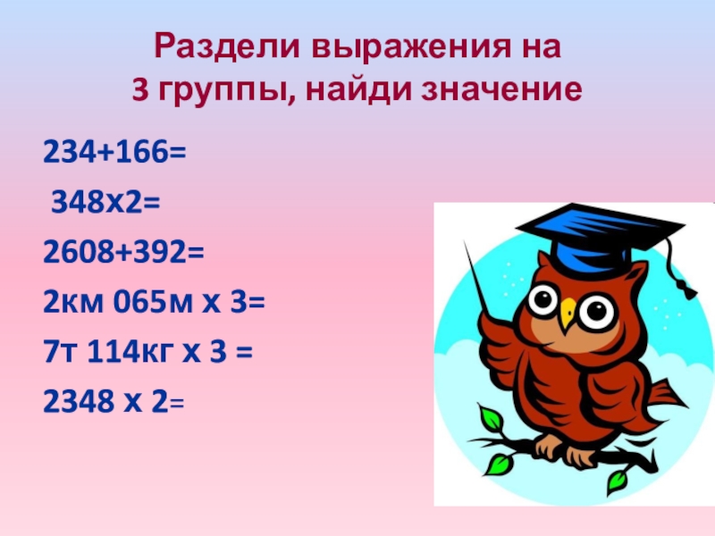Раздели выражения на  3 группы, найди значение234+166=     348х2=