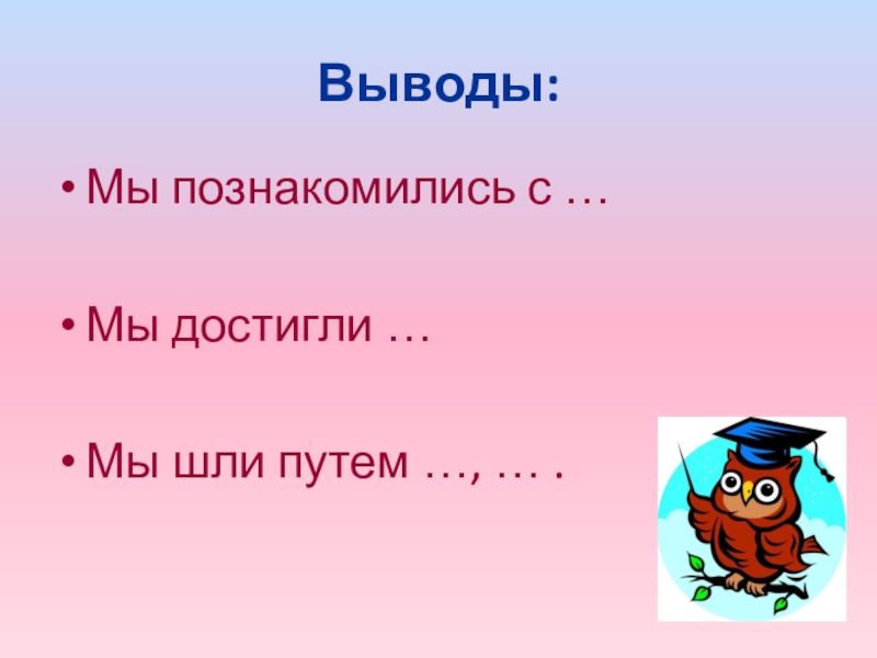 Выводы:Мы познакомились с …Мы достигли …Мы шли путем …, … .