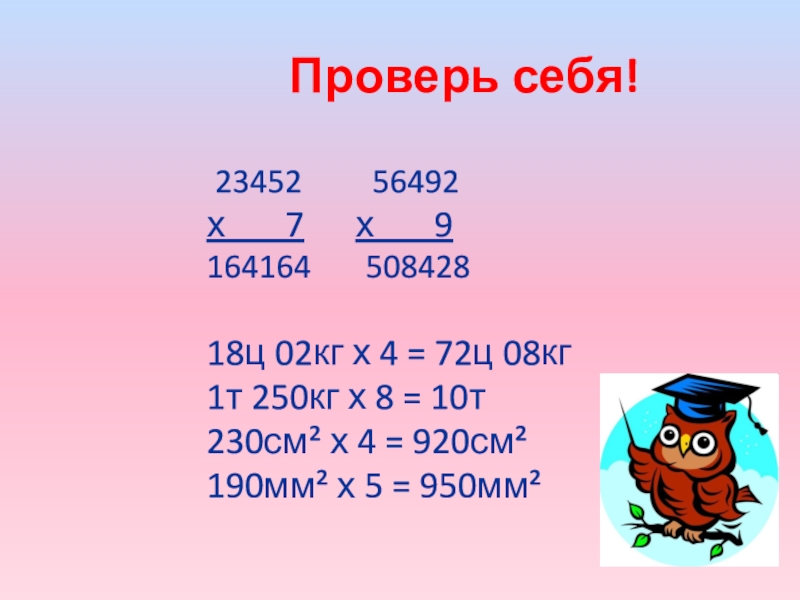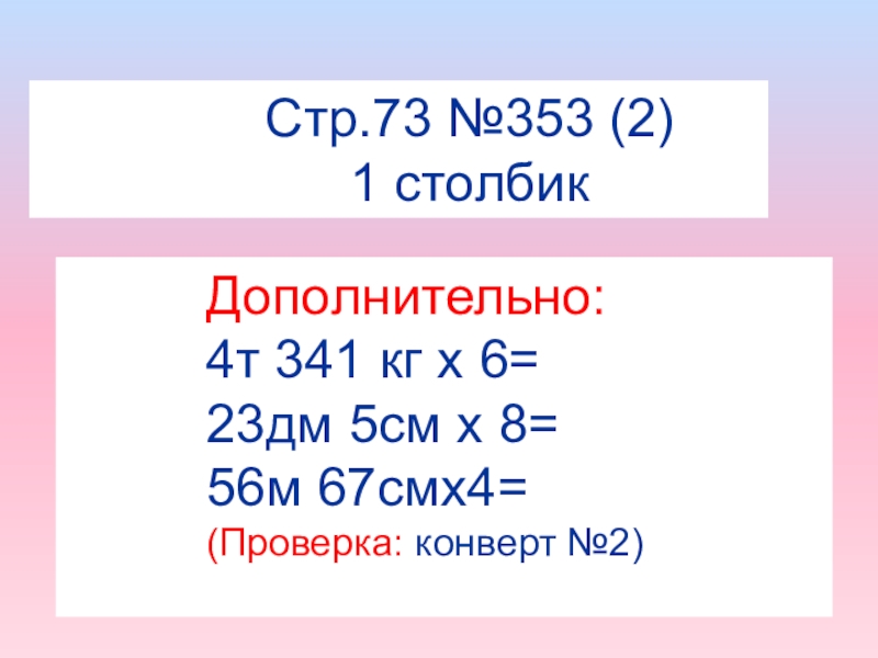 Стр.73 №353 (2)1 столбикДополнительно:4т 341 кг х 6=23дм 5см х 8=56м 67смх4= (Проверка: конверт №2)