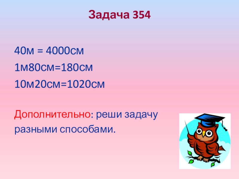 Задача 354 40м = 4000см1м80см=180см10м20см=1020смДополнительно: реши задачу разными способами.