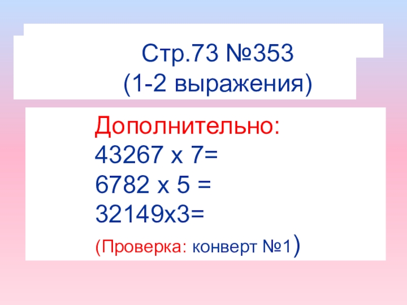 Стр.73 №353 (1-2 выражения)Дополнительно:43267 х 7= 6782 х 5 =32149х3= (Проверка: конверт №1)