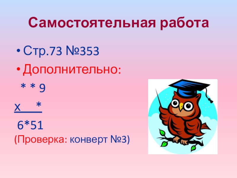 Самостоятельная работаСтр.73 №353Дополнительно: * * 9х   * 6*51(Проверка: конверт №3)