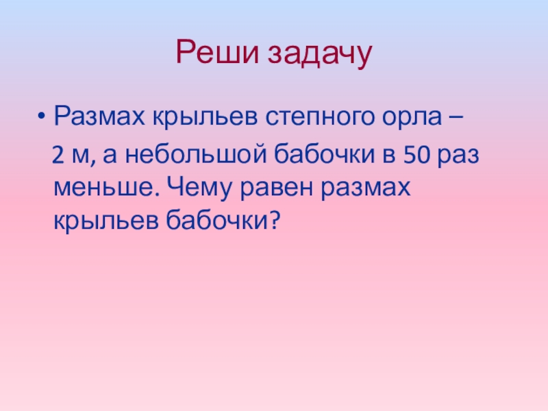 Реши задачуРазмах крыльев степного орла –  2 м, а небольшой бабочки в 50 раз меньше. Чему