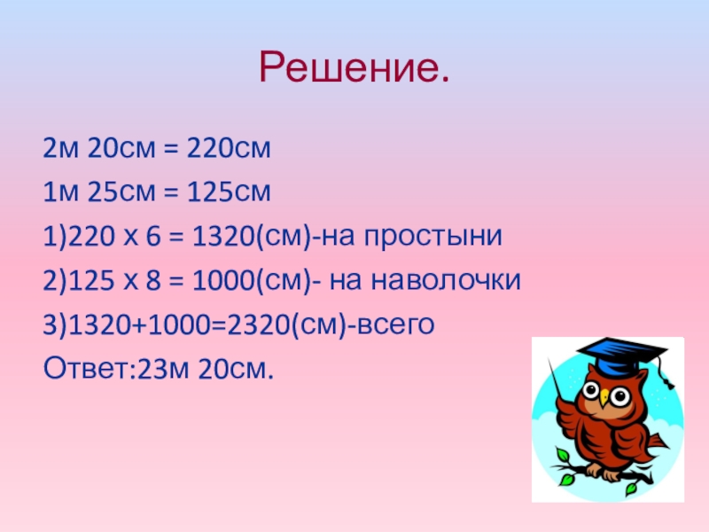 Решение.2м 20см = 220см1м 25см = 125см1)220 х 6 = 1320(см)-на простыни2)125 х 8 = 1000(см)- на