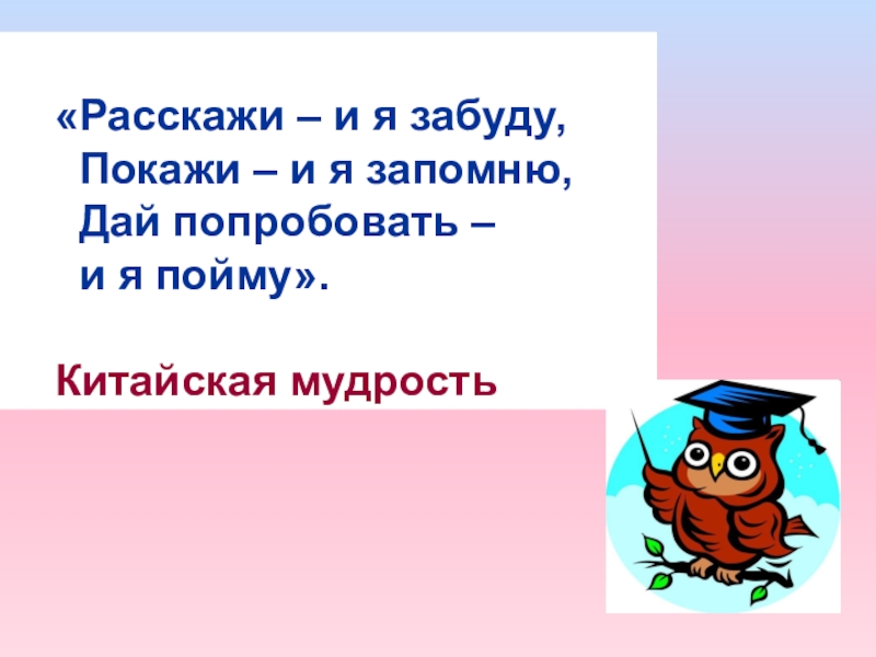 «Расскажи – и я забуду, Покажи – и я запомню, Дай попробовать –  и я пойму».Китайская