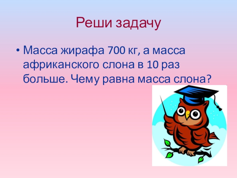 Реши задачуМасса жирафа 700 кг, а масса африканского слона в 10 раз больше. Чему равна масса слона?