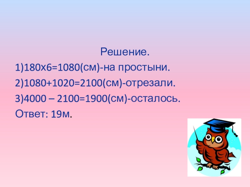Решение.1)180х6=1080(см)-на простыни.2)1080+1020=2100(см)-отрезали.3)4000 – 2100=1900(см)-осталось.Ответ: 19м.