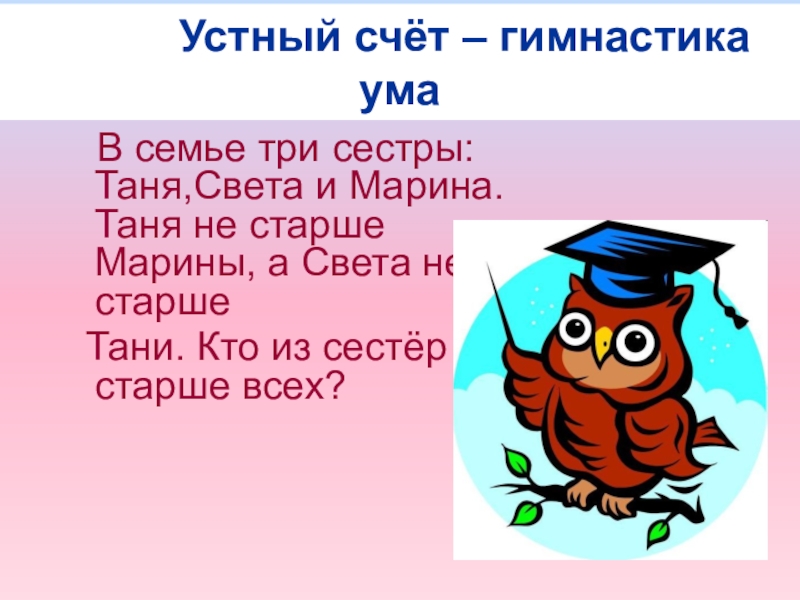 Устный счёт – гимнастика ума   В семье три сестры:Таня,Света и Марина.Таня не старше Марины, а