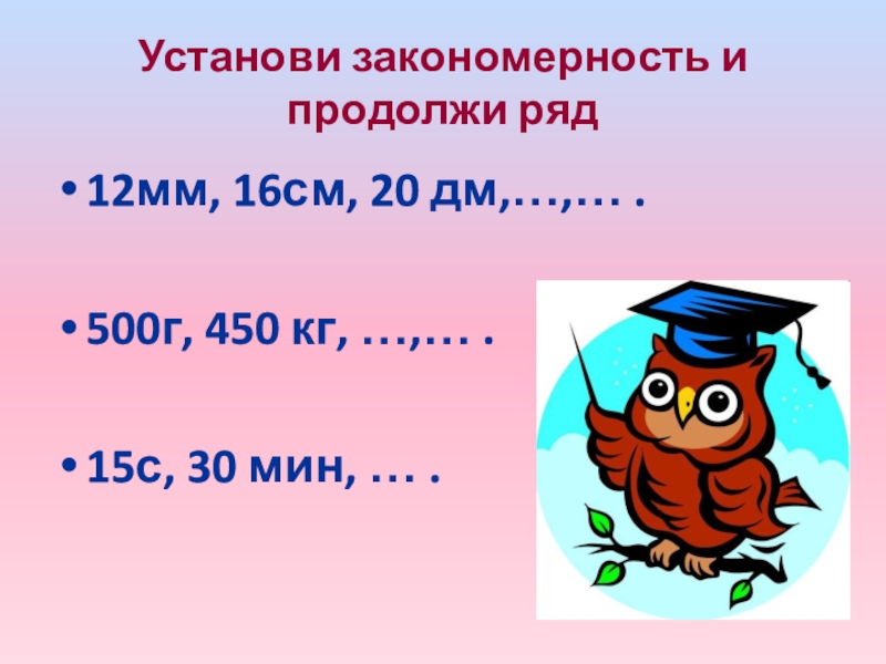 Установи закономерность и продолжи ряд12мм, 16см, 20 дм,…,… .500г, 450 кг, …,… .15с, 30 мин, … .