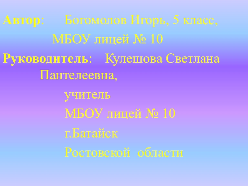 Автор: 		Богомолов Игорь, 5 класс,				МБОУ лицей № 10 Руководитель: 	 Кулешова Светлана 					Пантелеевна, 					учитель 					МБОУ лицей №