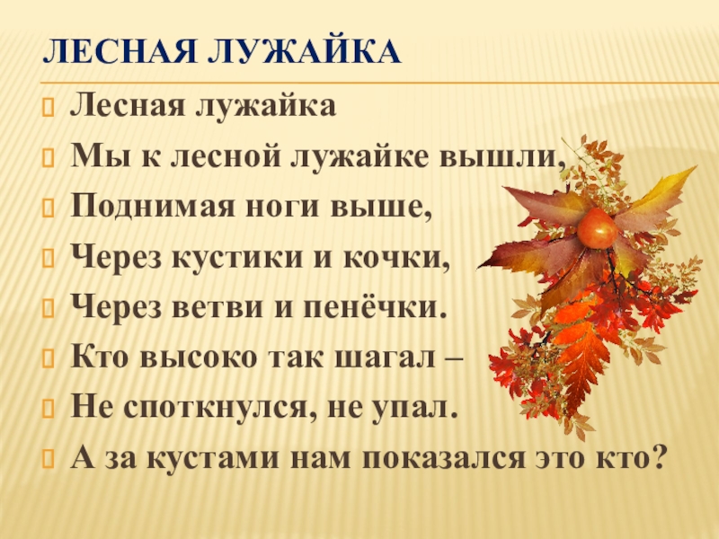 Лесная лужайкаЛесная лужайкаМы к лесной лужайке вышли,Поднимая ноги выше,Через кустики и кочки,Через ветви и пенёчки.Кто высоко так