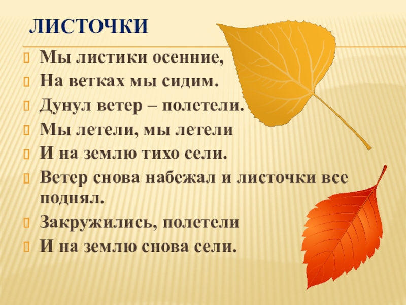 ЛисточкиМы листики осенние,На ветках мы сидим.Дунул ветер – полетели.Мы летели, мы летелиИ на землю тихо сели.Ветер снова