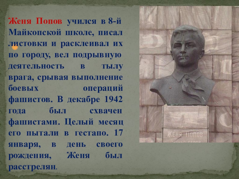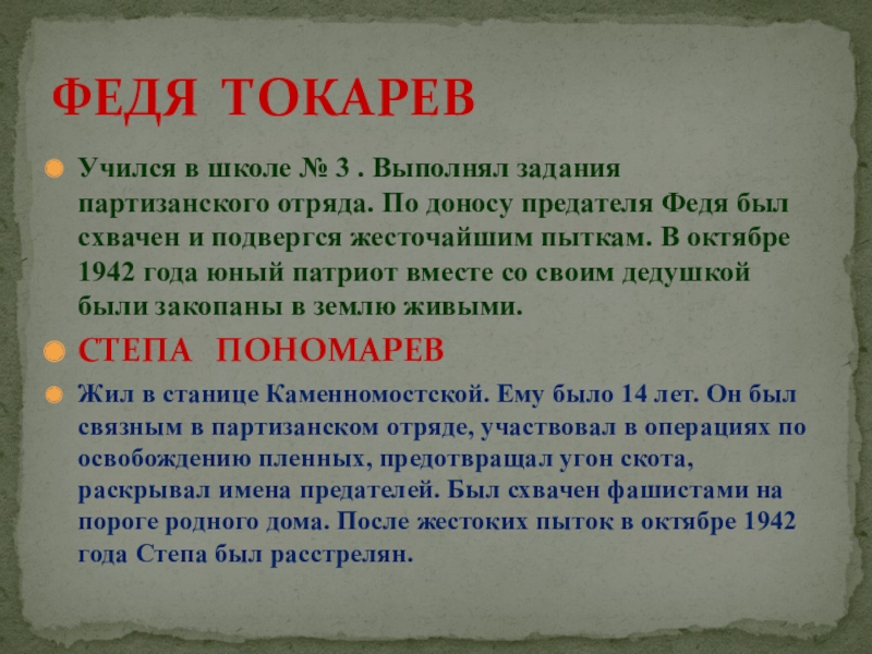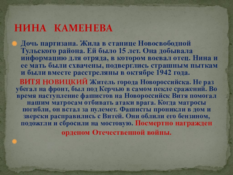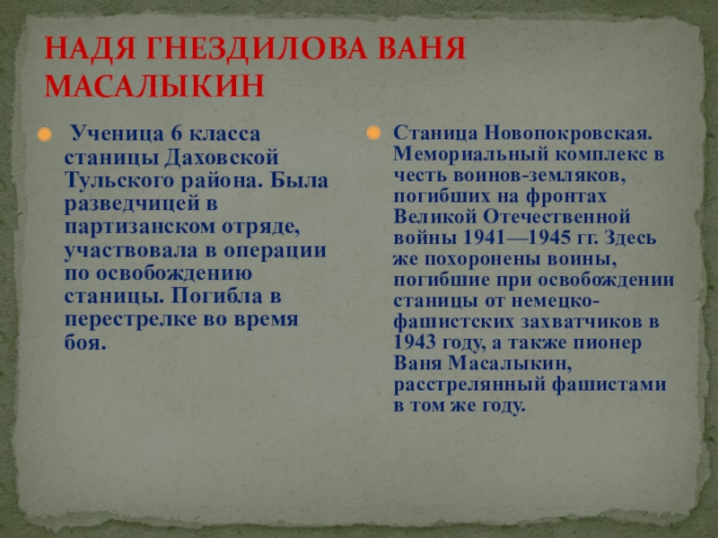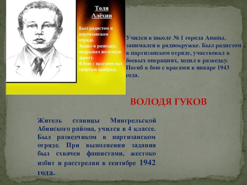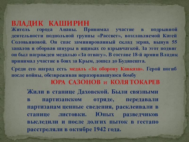 Жили в станице Даховской. Были связными в партизанском отряде, передавали партизанам ценные сведения, расклеивали в станице листовки. Юных разведчиков выследили и после долгих пыток в гестапо расстреляли в октябре 1942 года.