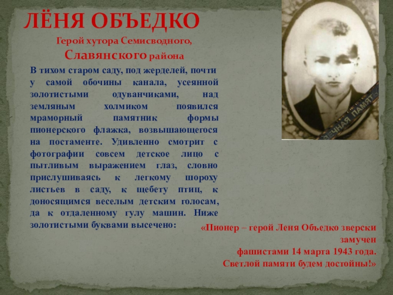 «Пионер – герой Леня Объедко зверски замучен