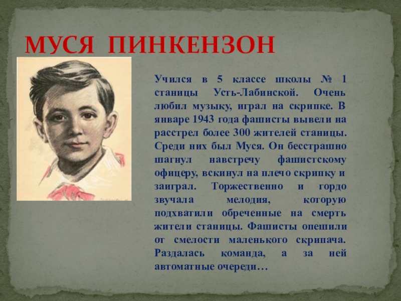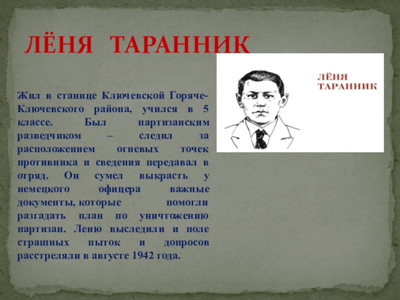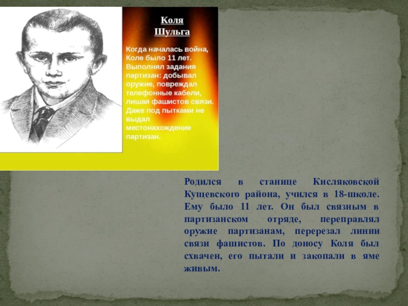 Житель станицы Мингрельской Абинского района, учился в 4 классе. Был разведчиком в партизанском отряде. При выполнении задания был схвачен фашистами, жестоко избит и расстрелян в сентябре 1942 года.
